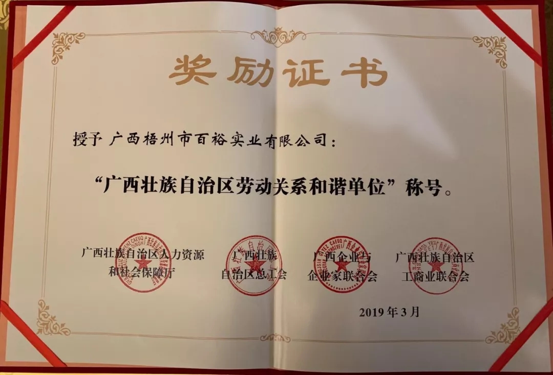 近日,百裕集團(tuán)先后榮獲“廣西壯族自治區(qū)勞動(dòng)關(guān)系和諧單位”、2018年度廣西壯族自治區(qū)“守合同重信用”企業(yè)稱號。