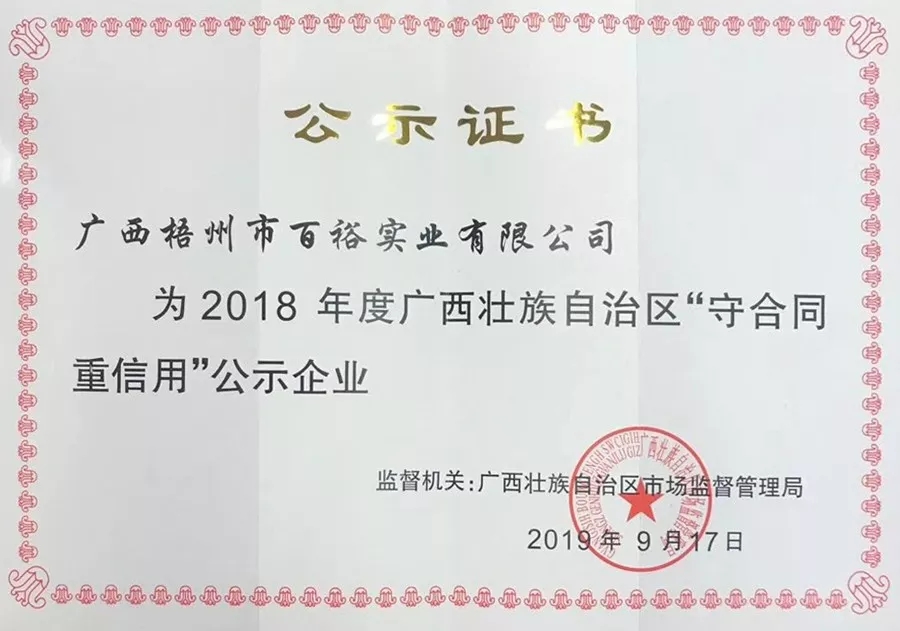 10月25日,百裕集團(tuán)獲得自治區(qū)市場監(jiān)督管理局授予的2018年度廣西壯族自治區(qū)“守合同重信用”公示企業(yè)稱號,并授予獎(jiǎng)牌和證書。百裕連續(xù)多年獲此殊榮,這是主管部門對百裕在誠信經(jīng)營、體系建設(shè)以及維護(hù)合同信用等方面的充分肯定與認(rèn)可。公司始終堅(jiān)持誠信經(jīng)營、堅(jiān)守品質(zhì),樹立良好的口碑和企業(yè)形象