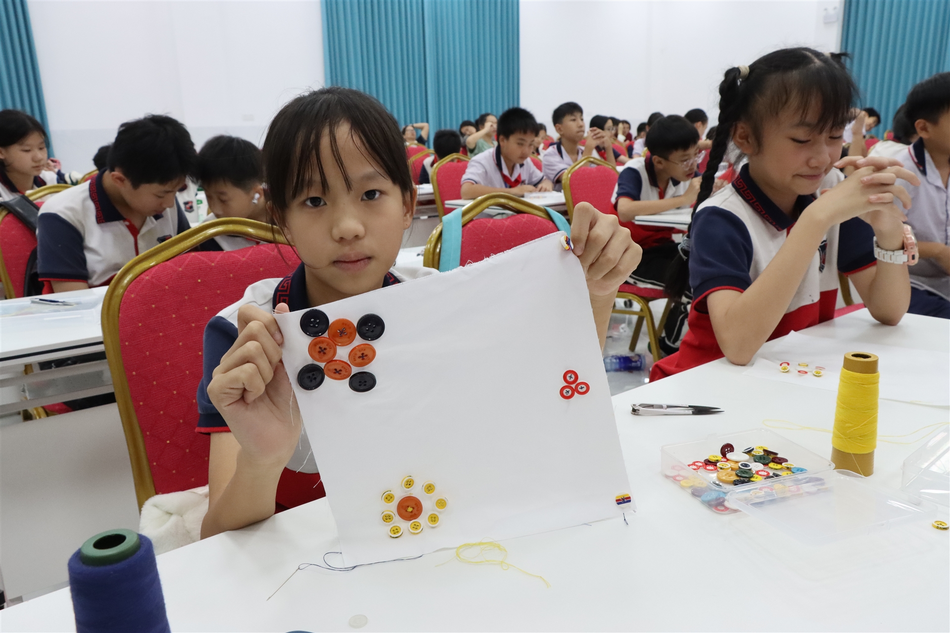孩子們還體驗(yàn)了一場(chǎng)別開生面的服飾小制作,領(lǐng)略了制作之美。在老師的指導(dǎo)下,學(xué)生們首先了解紐扣的基本構(gòu)造和縫制紐扣的步驟要領(lǐng),之后再自己動(dòng)手做“針線活”,用略顯稚嫩的小手把扣子穿牢固定,還發(fā)揮了自己的想象力,把不同的扣子組合拼接,形成一幅幅生動(dòng)的花朵“畫作”。