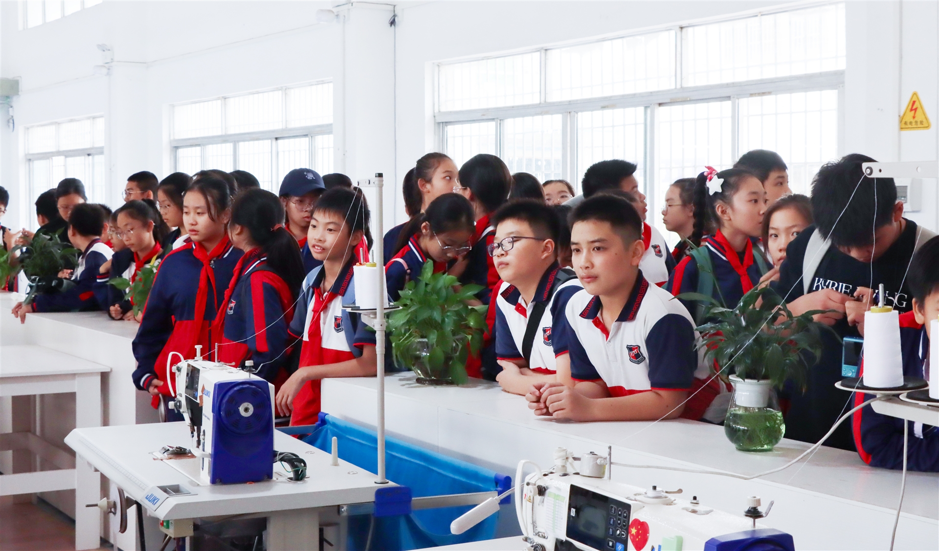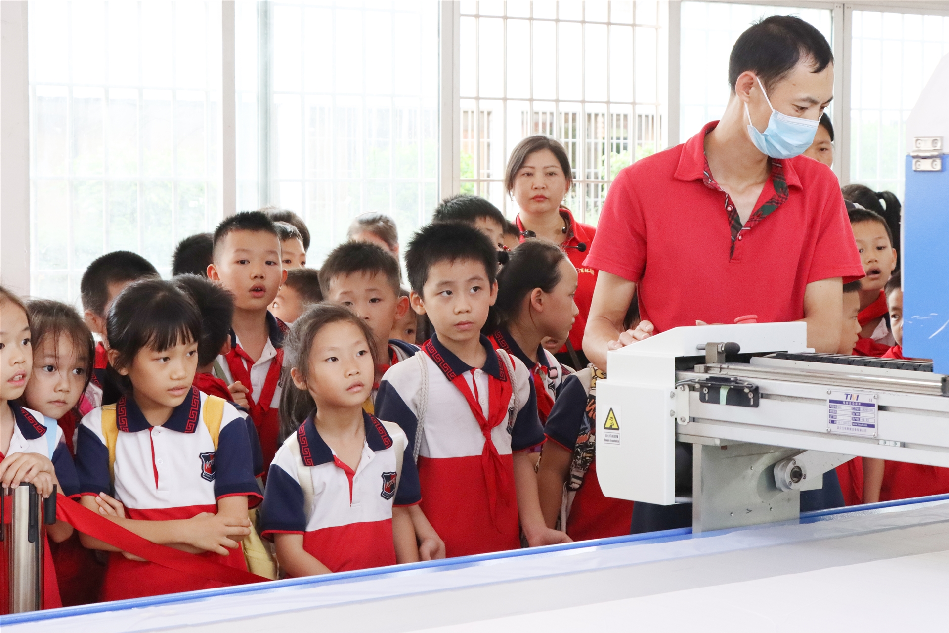 走進(jìn)百裕服裝的生產(chǎn)車間,孩子們興奮的到處張望,寬大整潔的車間里擺放著一臺(tái)臺(tái)先進(jìn)的生產(chǎn)設(shè)備,工人們正在制作生產(chǎn)。在講解員的引領(lǐng)下,帶著孩子們了解校服制作的流程和生產(chǎn)工藝,直觀的感受校服是如何生產(chǎn)的。