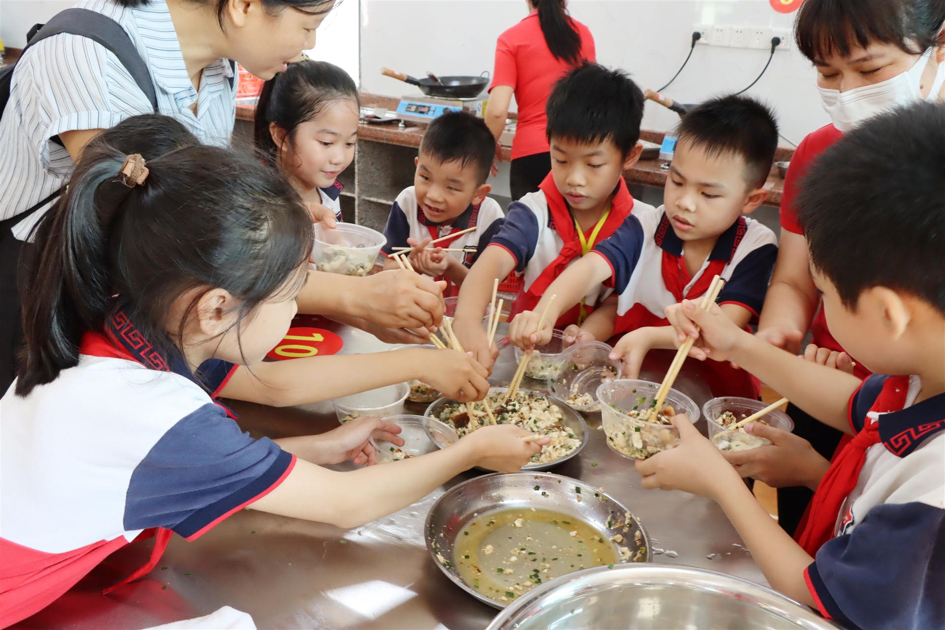 桌子上擺放著面粉、調(diào)好的餡料還有搟面杖,孩子們變身成了小小廚師,在家長(zhǎng)的指導(dǎo)下迫不及待地制作餃子:他們拿起餃子皮,舀上餡料,小心翼翼地捏合......熱鬧的現(xiàn)場(chǎng)氛圍不時(shí)傳出陣陣歡笑聲。