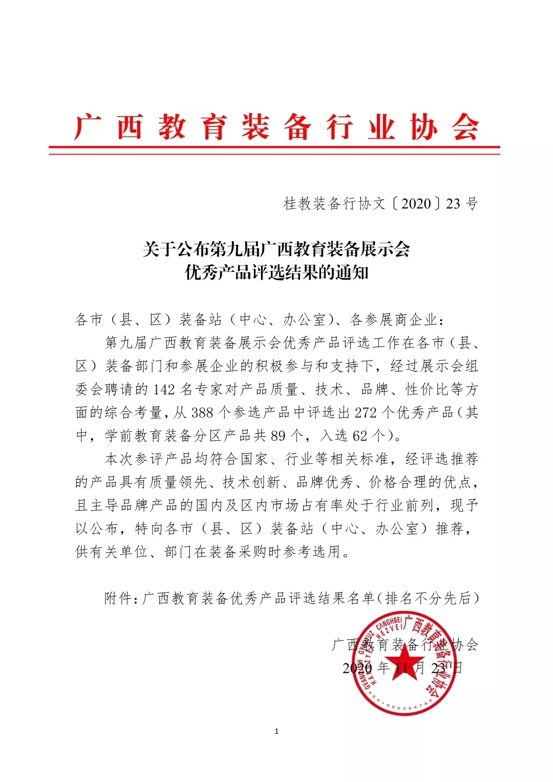 第九屆廣西教育裝備展示會優(yōu)秀產(chǎn)品評選工作在各市(縣、區(qū))裝備部門和參展企業(yè)的積極參與和支持下,經(jīng)過展示會組委會聘請的142名專家現(xiàn)場對參賽產(chǎn)品質量、技術、品牌、性價比等方面的綜合考量,從388個參選產(chǎn)品中評選出272個優(yōu)秀產(chǎn)品。