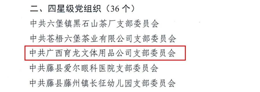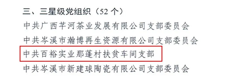 近日,中共梧州市委員會組織部印發(fā)《關(guān)于公布2020年度梧州市兩新組織星級黨組織名單的通知》,對全市109家兩新組織星級黨組織名單進行公布,其中,百裕實業(yè)黨支部獲評“五星級黨組織”稱號,育龍黨支部獲評“四星級黨組織”稱號,百裕那蓬扶貧車間獲評“三星級黨組織”稱號。