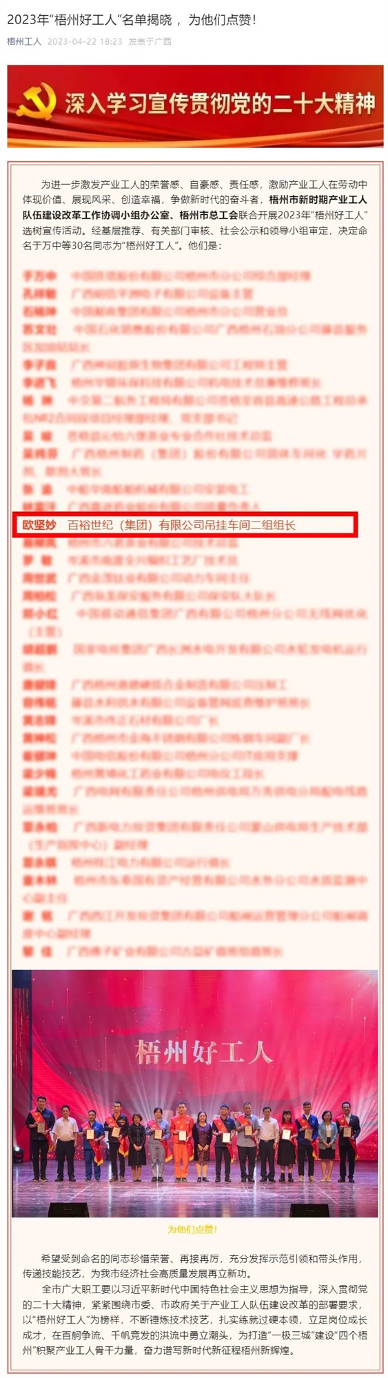為進(jìn)一步激發(fā)產(chǎn)業(yè)工人的榮譽(yù)感、自豪感、責(zé)任感,激勵產(chǎn)業(yè)工人在勞動中體現(xiàn)價(jià)值、展現(xiàn)風(fēng)采、創(chuàng)造幸福,爭做新時代的奮斗者,梧州市新時期產(chǎn)業(yè)工人隊(duì)伍建設(shè)改革工作協(xié)調(diào)小組辦公室、梧州市總工會聯(lián)合開展2023年“梧州好工人”選樹宣傳活動。經(jīng)基層推薦、有關(guān)部門審核、社會公示和領(lǐng)導(dǎo)小組審定,最終樹了30名“梧州好工人”。其中,百裕世紀(jì)(集團(tuán))有限公司吊掛車間二組組長歐堅(jiān)妙榜上有名。
