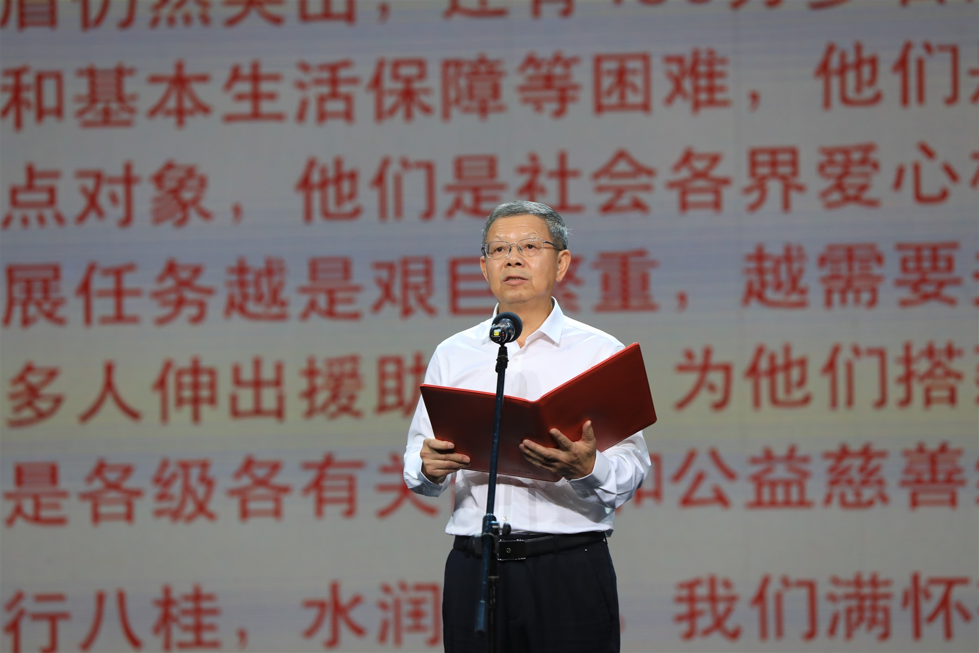 廣西慈善總會(huì)會(huì)長(zhǎng)、自治區(qū)政協(xié)第十一、十二屆原副主席劉正東宣讀慈善倡議書(shū)