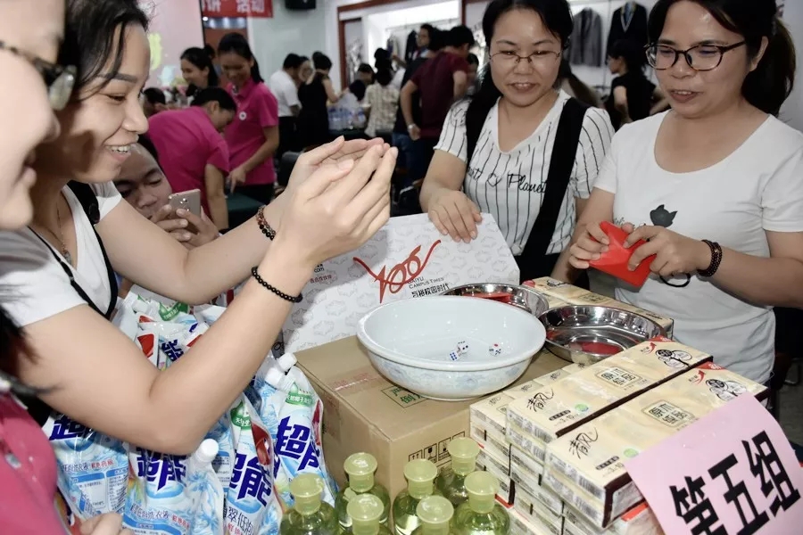 博餅的號角一經(jīng)蔡總經(jīng)理吹響,各個小組(八人圍成一桌,妥妥準備就緒)果斷開撕,場面十足熱鬧。一時間,骰子與碗碰撞的清脆聲、奪得大獎時的歡呼聲此起彼伏。