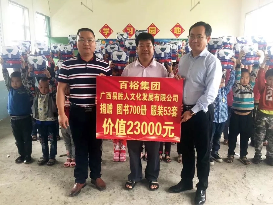 百裕集團(tuán)服務(wù)河池地區(qū)已有6年多,多年來開展了一系列的捐贈助學(xué)的公益活動。時值六一兒童節(jié),百裕集團(tuán)不忘初心,兌現(xiàn)“為環(huán)江村屯學(xué)校捐贈1106套愛心校服”承諾,并增加圖書等物資捐贈,在總經(jīng)理林志煌的帶領(lǐng)下,先后走進(jìn)環(huán)江縣10個鄉(xiāng)14個村級小學(xué),惠及1106名小朋友,為孩子們送上節(jié)日的祝福。